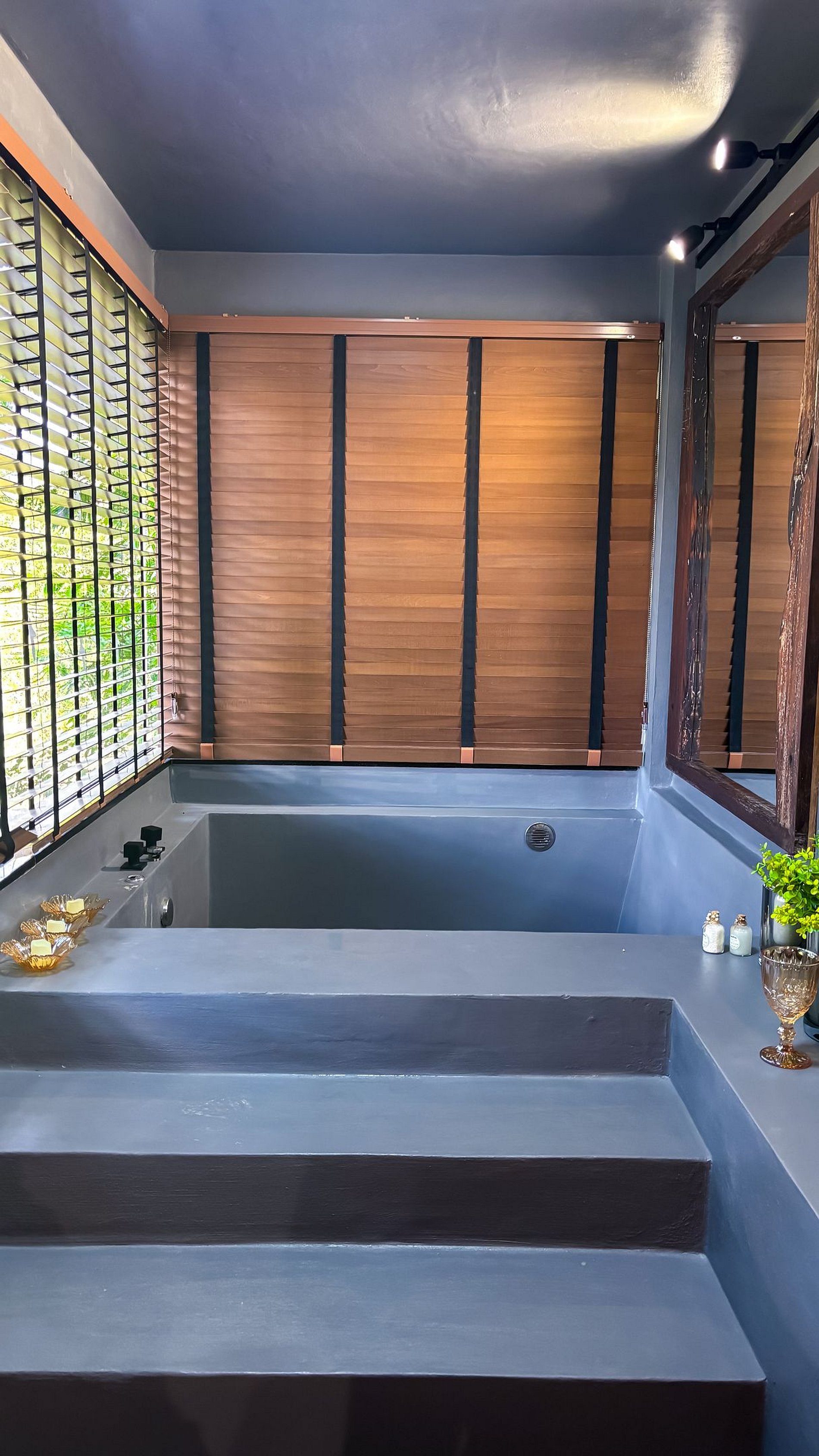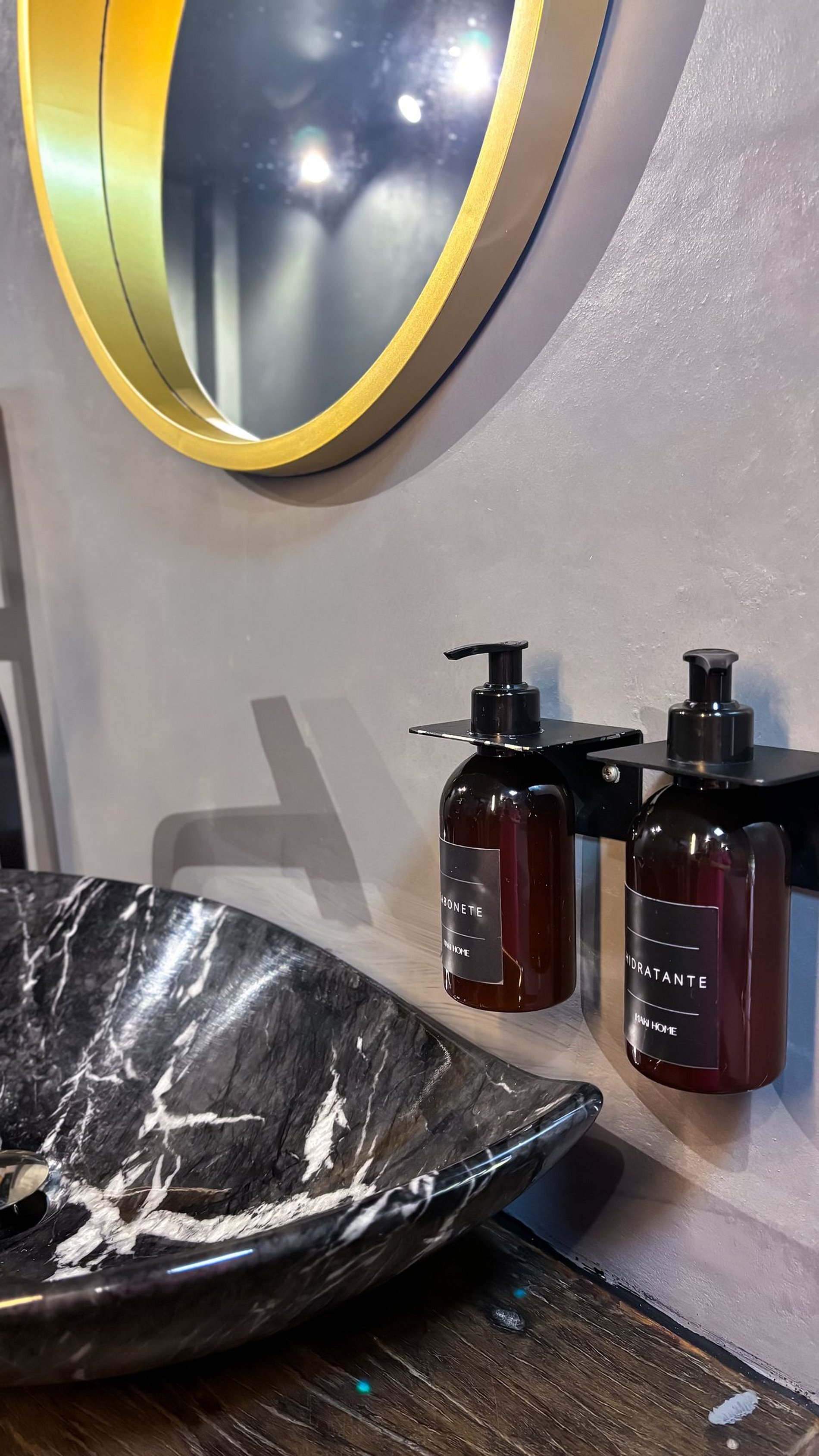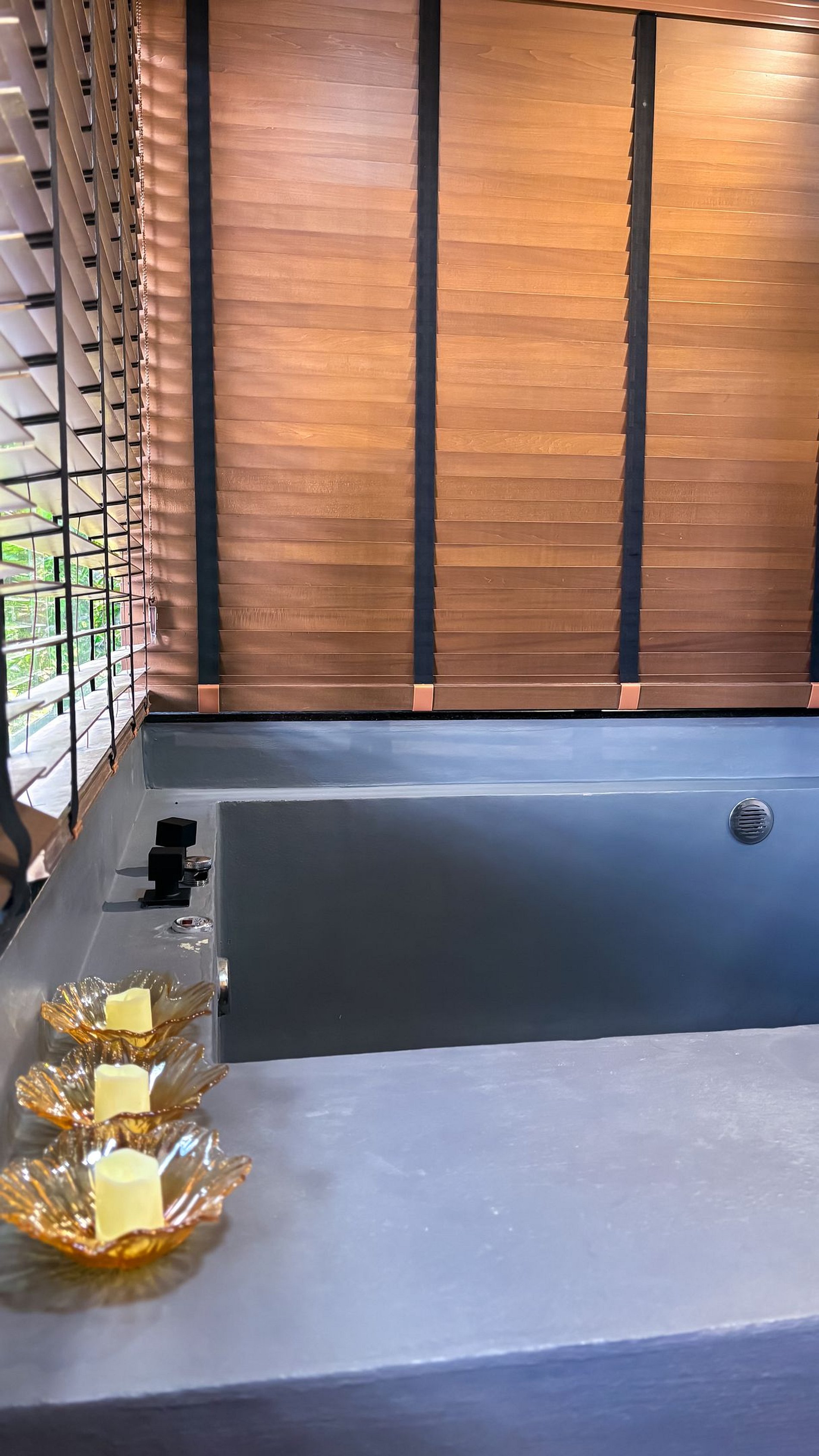 Banheira de imersão com vista, secador de cabelo e kit completo de sabonete, shampoo, condicionador e hidratante.