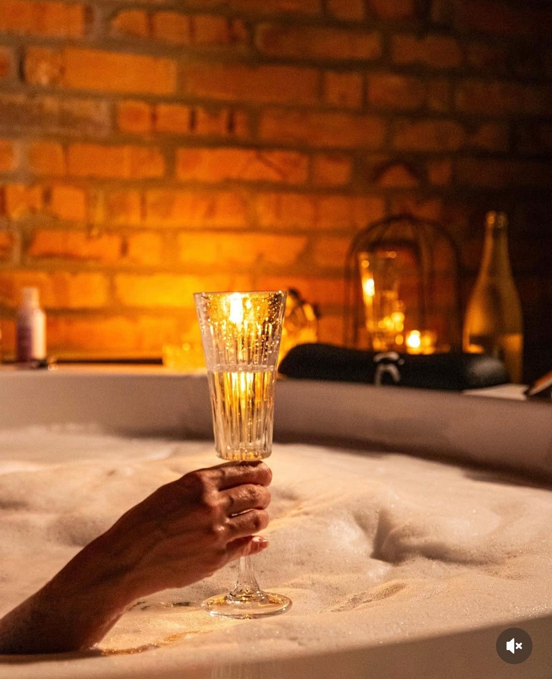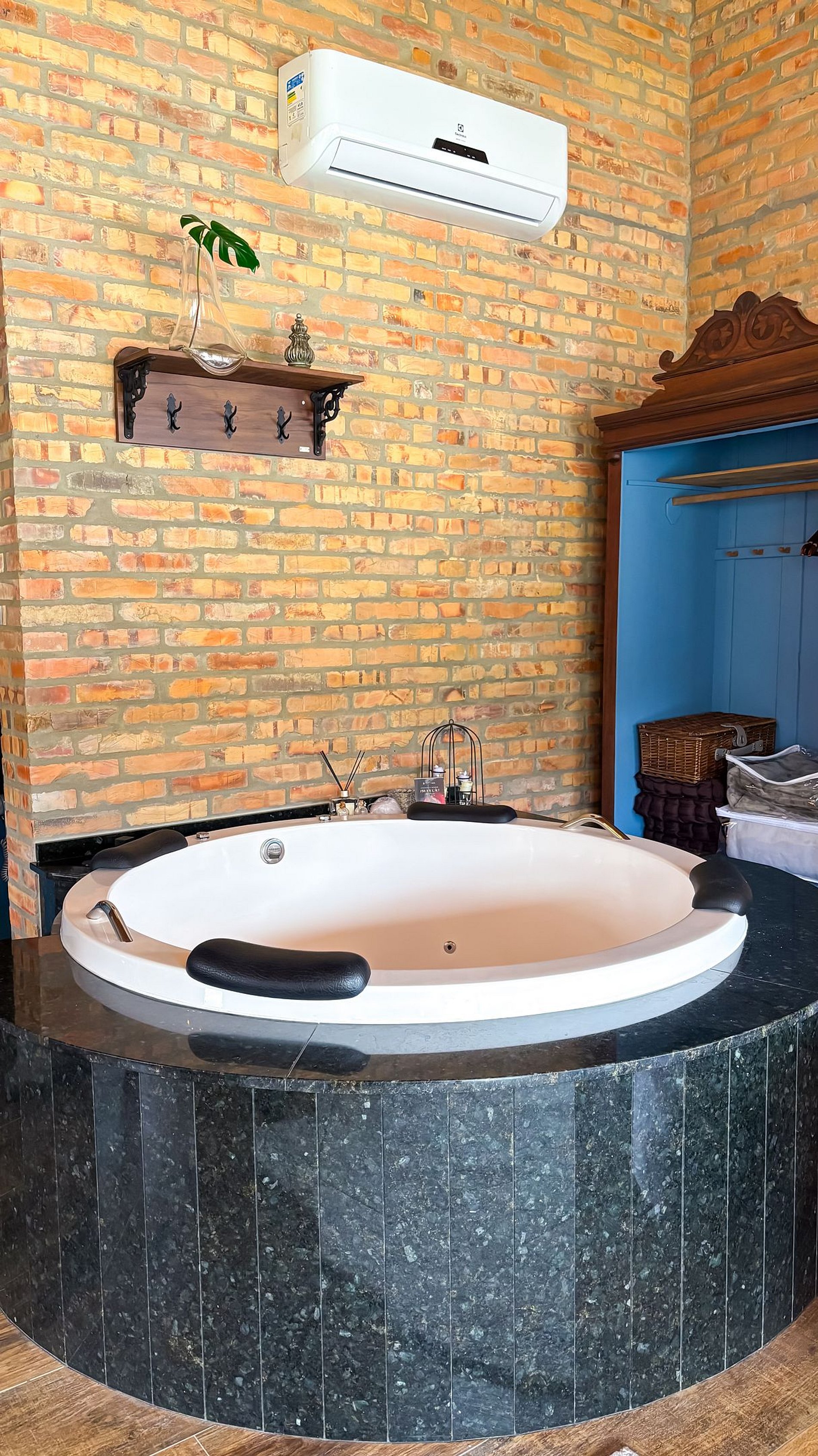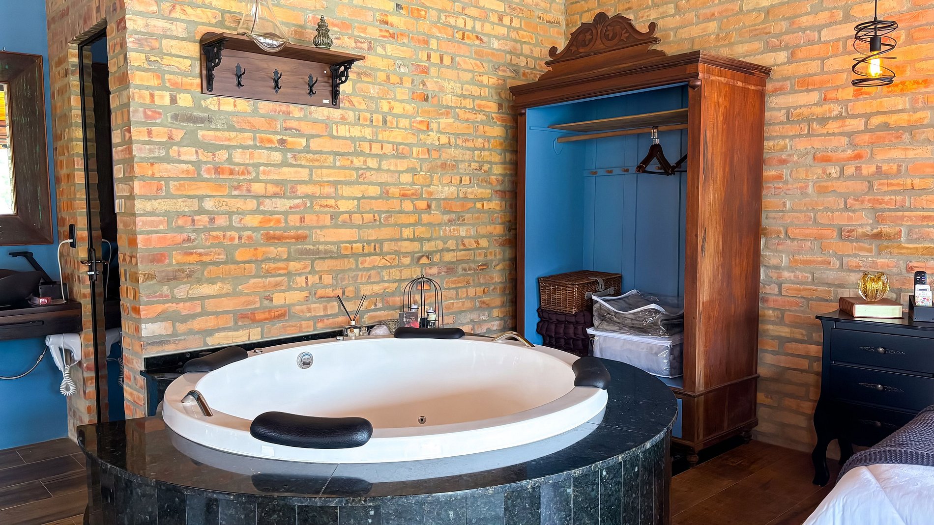Banheira de hidromassagem , secador de cabelo e kit completo de sabonete, shampoo, condicionador e hidratante.