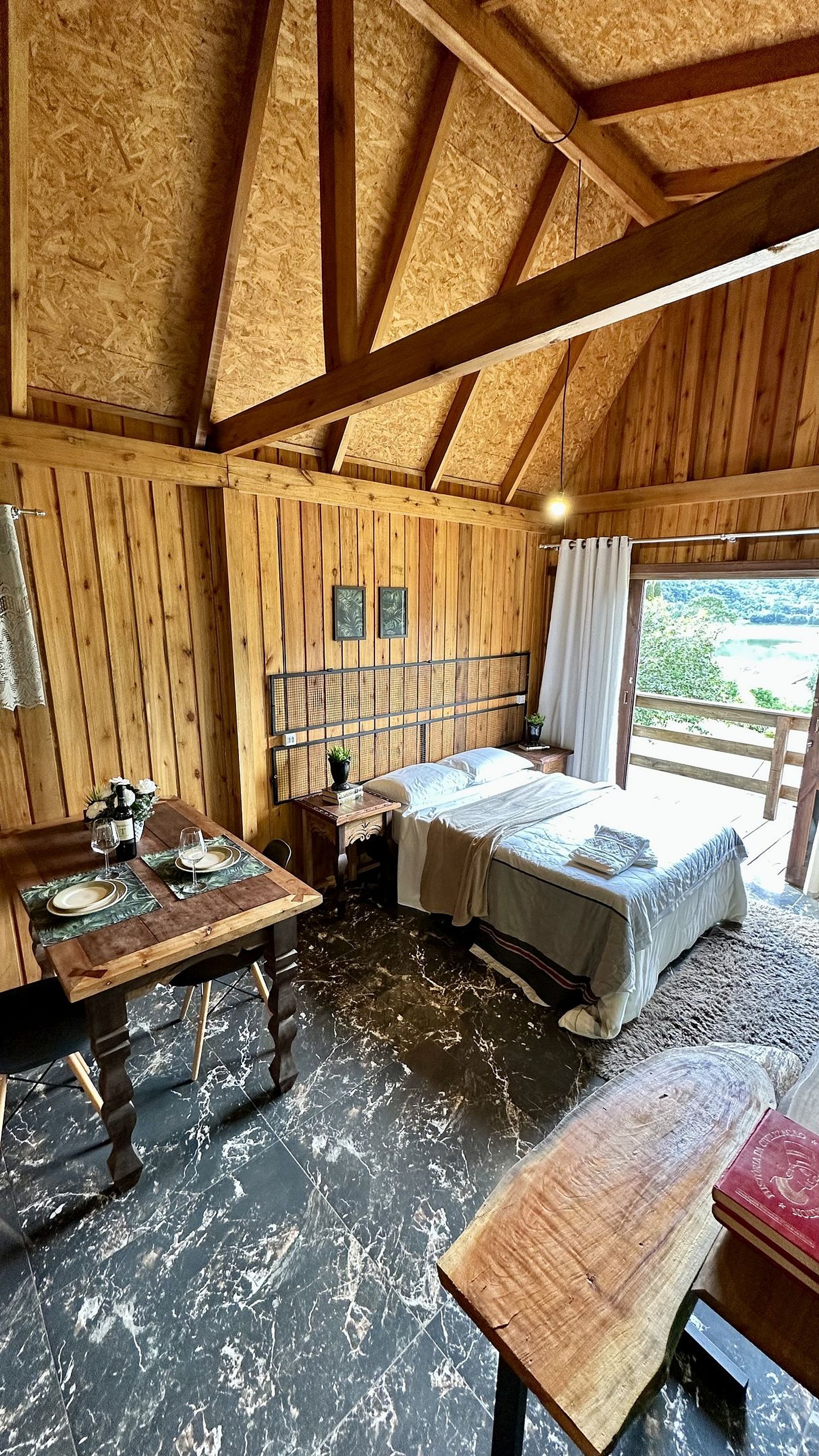 Uma cabana privativa e estilosa, com ambientes integrados, romântica e com vista para o lago, cachoeiras e pedreiras.