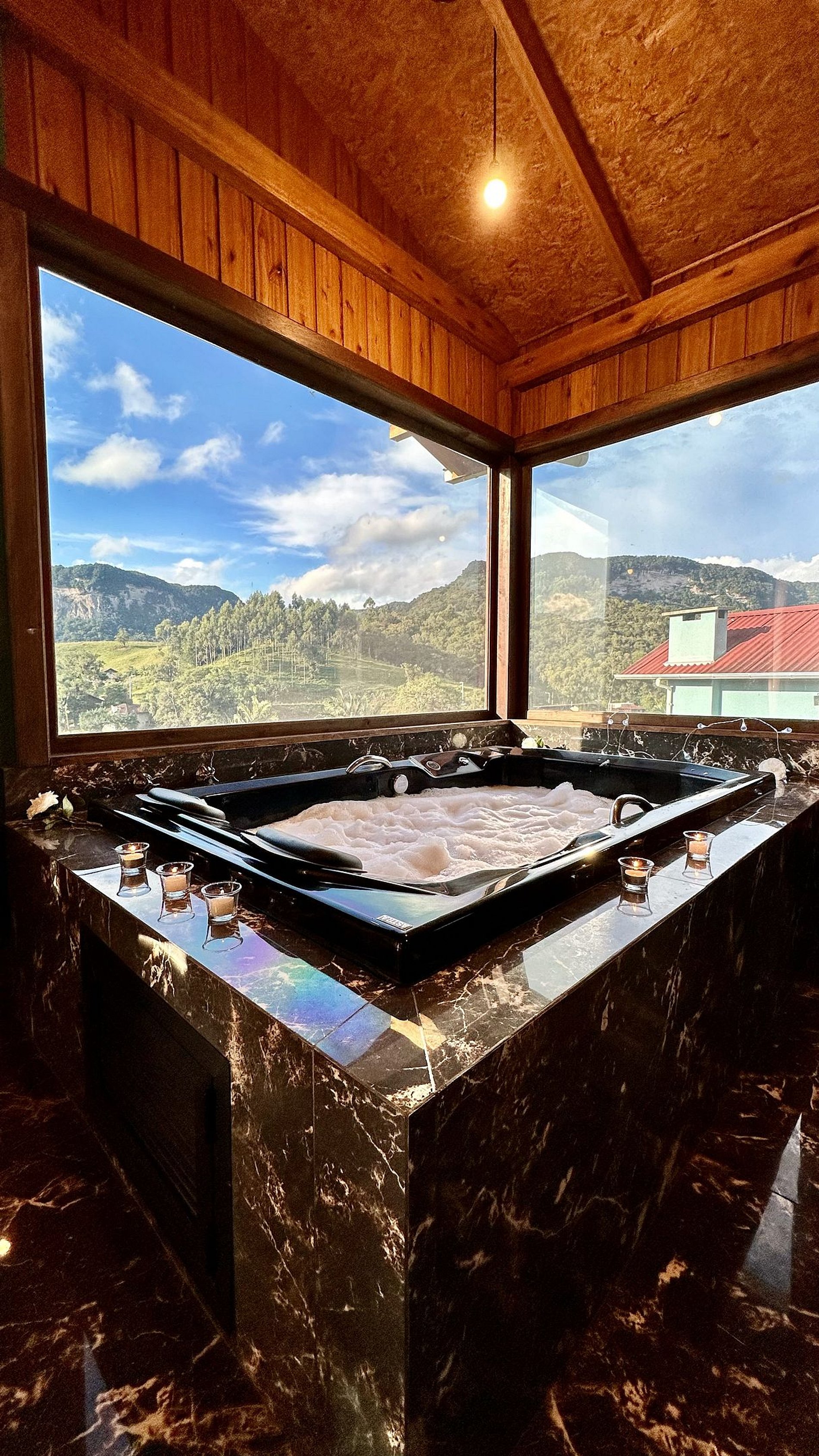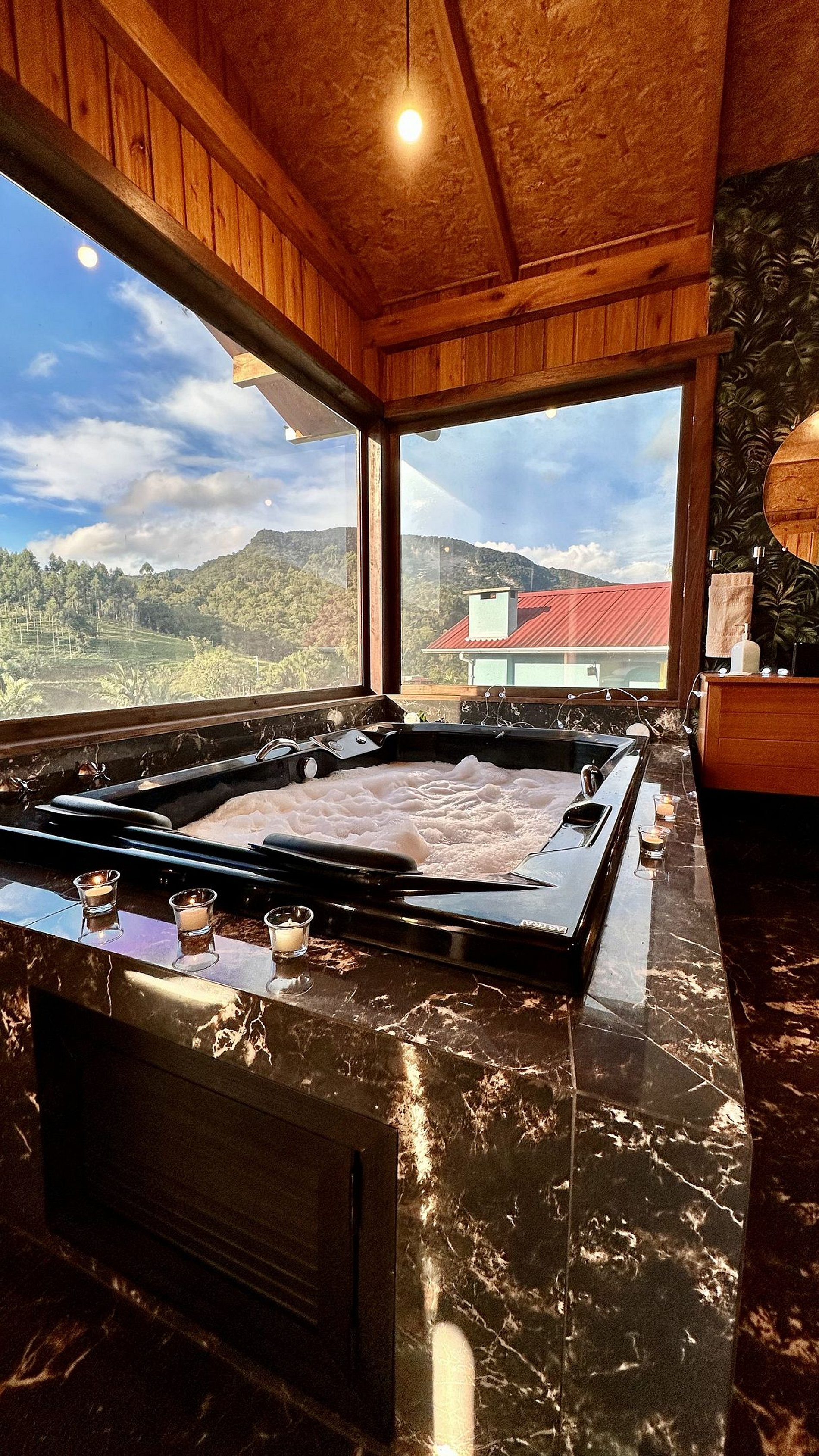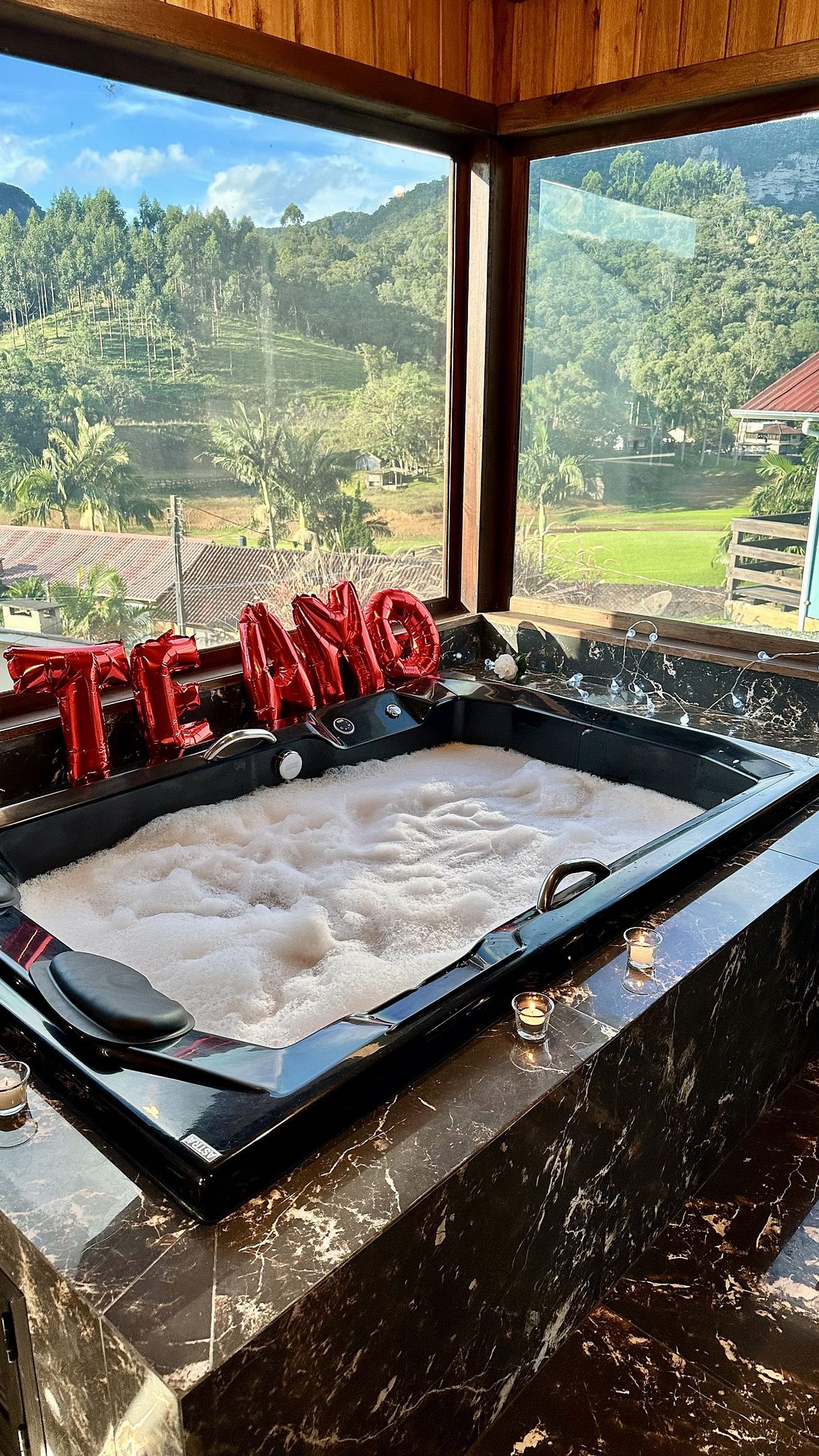 Banheira de hidromassagem para casal, com sais de banho. Chuveiro e torneiras aquecidas a gás com uma linda vista para a natureza.