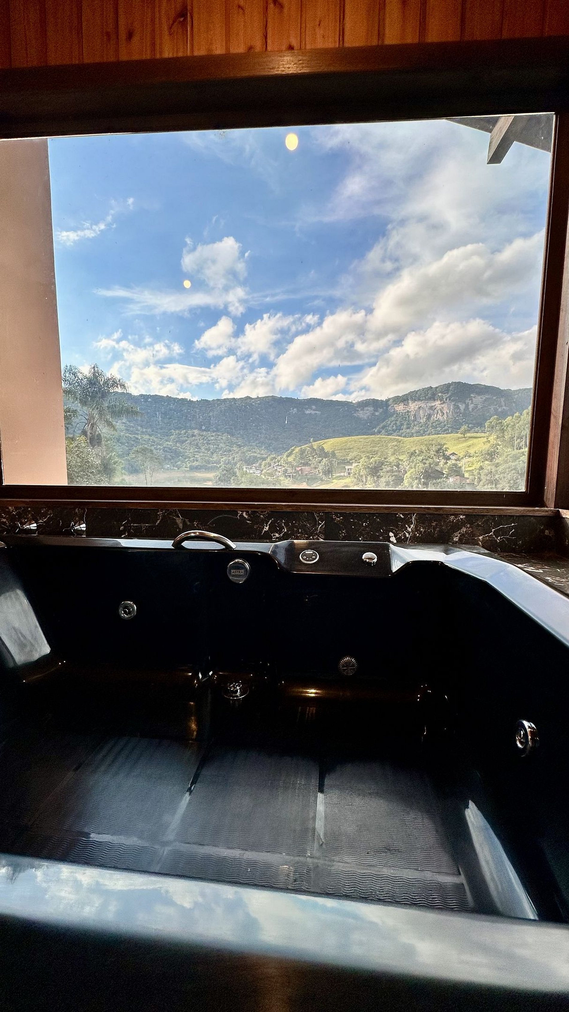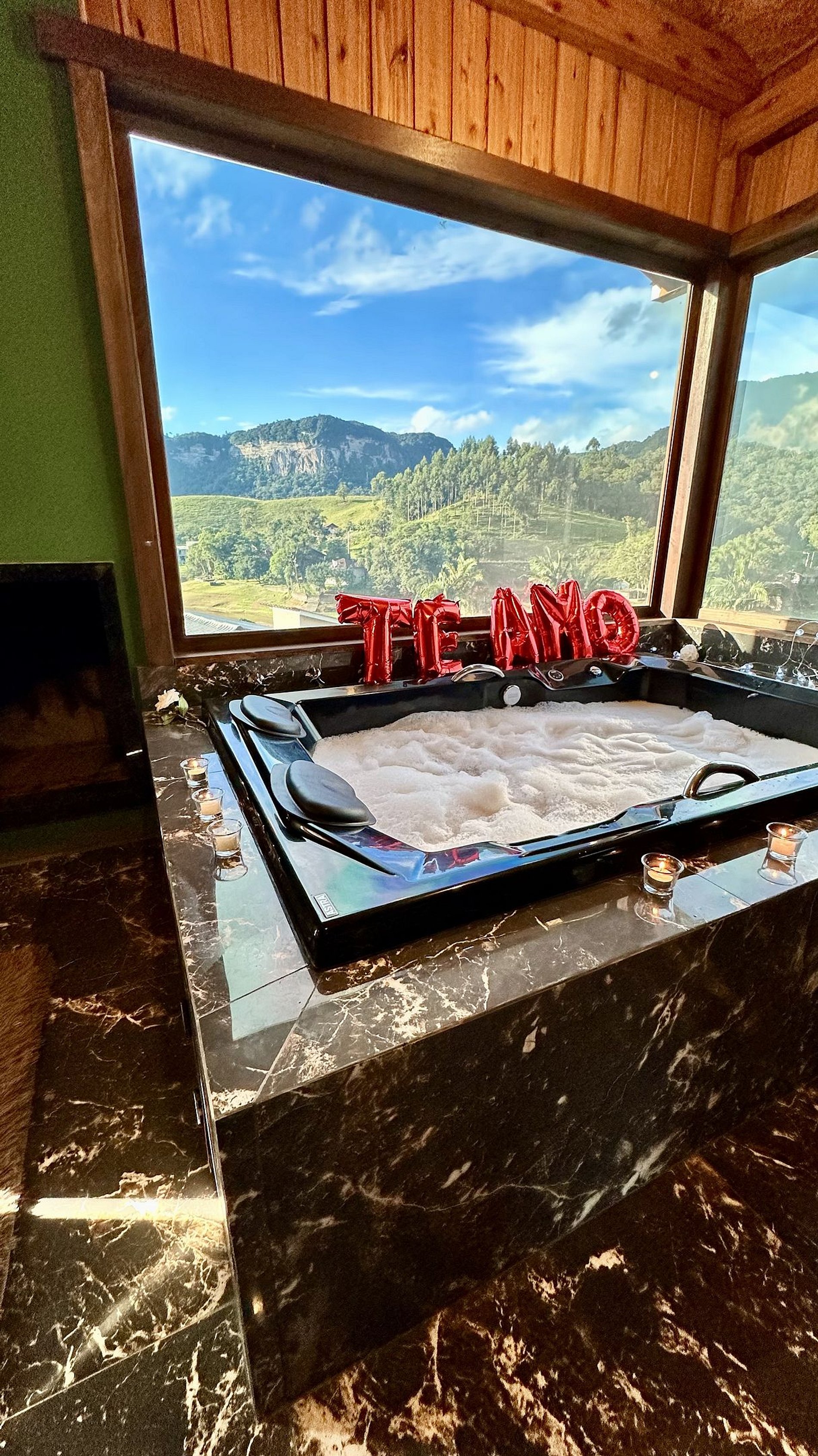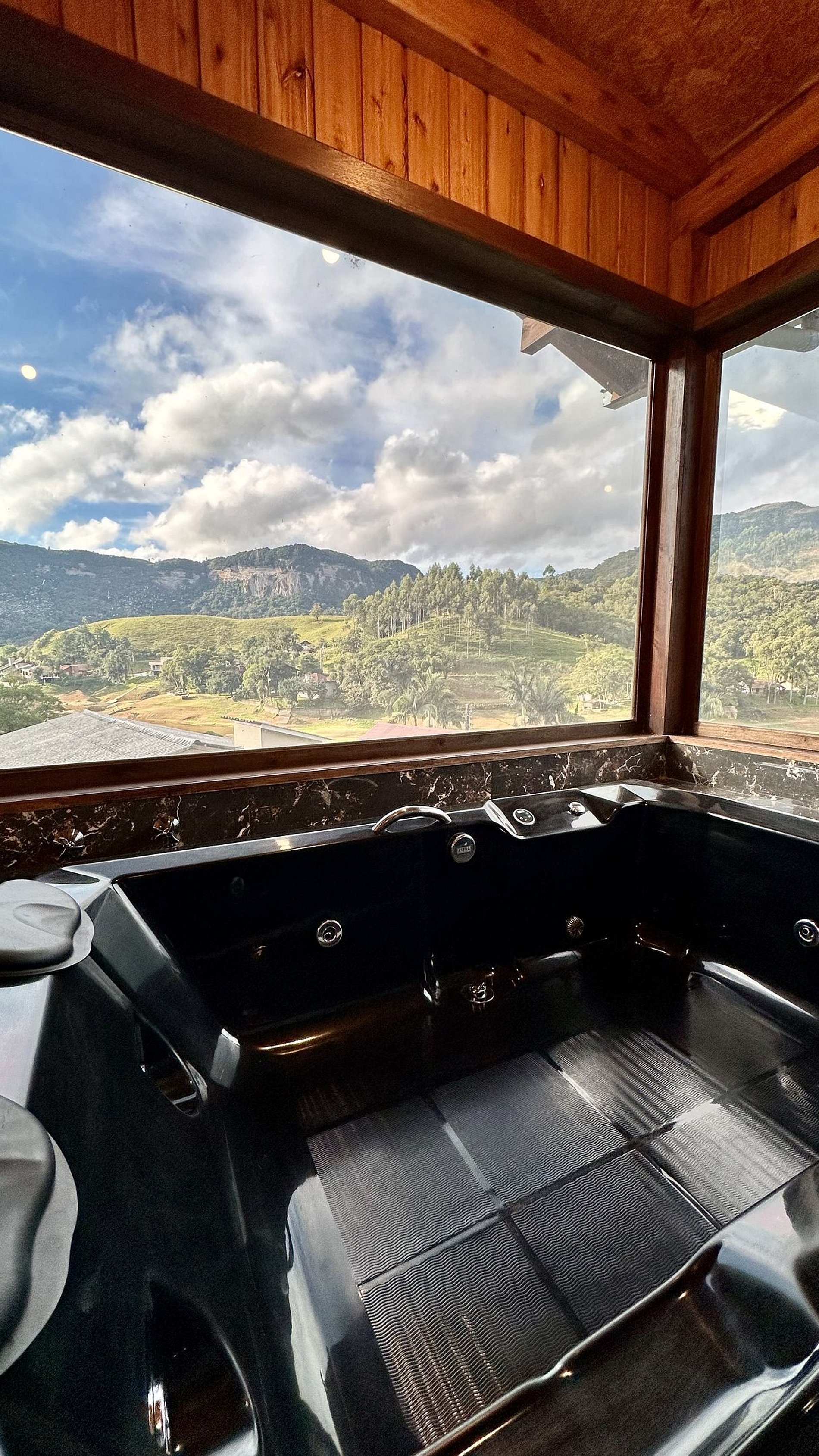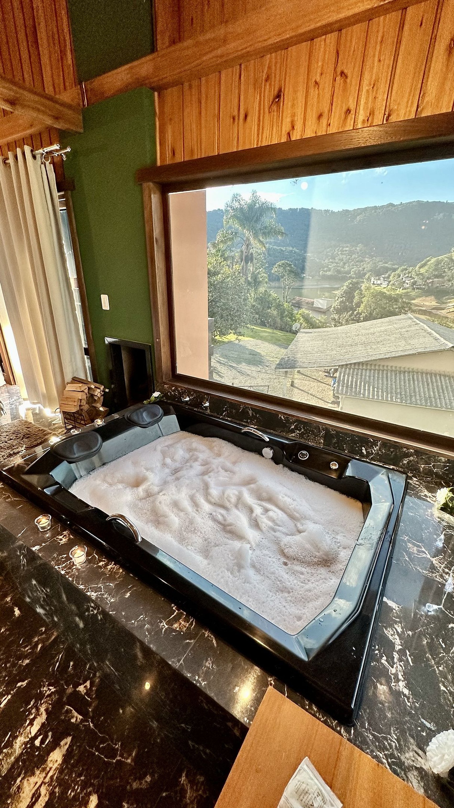 Banheira de hidromassagem para casal, com sais de banho. Chuveiro e torneiras aquecidas a gás com uma linda vista para a natureza.